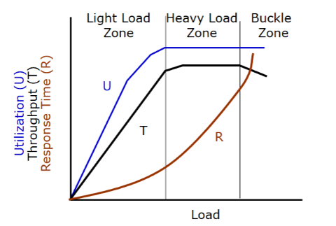 En el gráfico, T define el número de transacciones que se completan en un periodo de tiempo. U define la cantidad de recursos del servidor (CPU o memoria) que se consume. R es el tiempo que necesita el servidor para procesar la respuesta de la información solicitada.